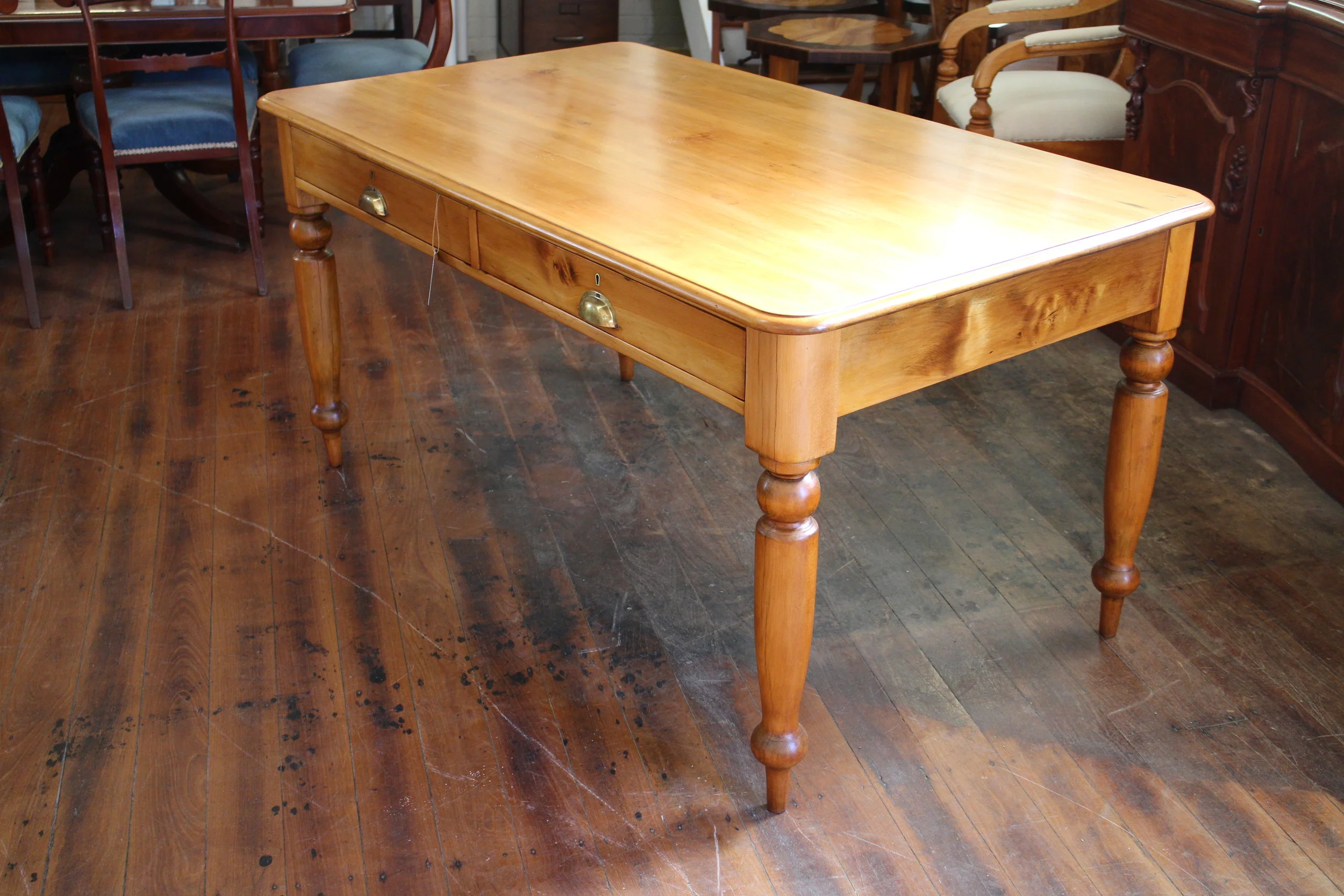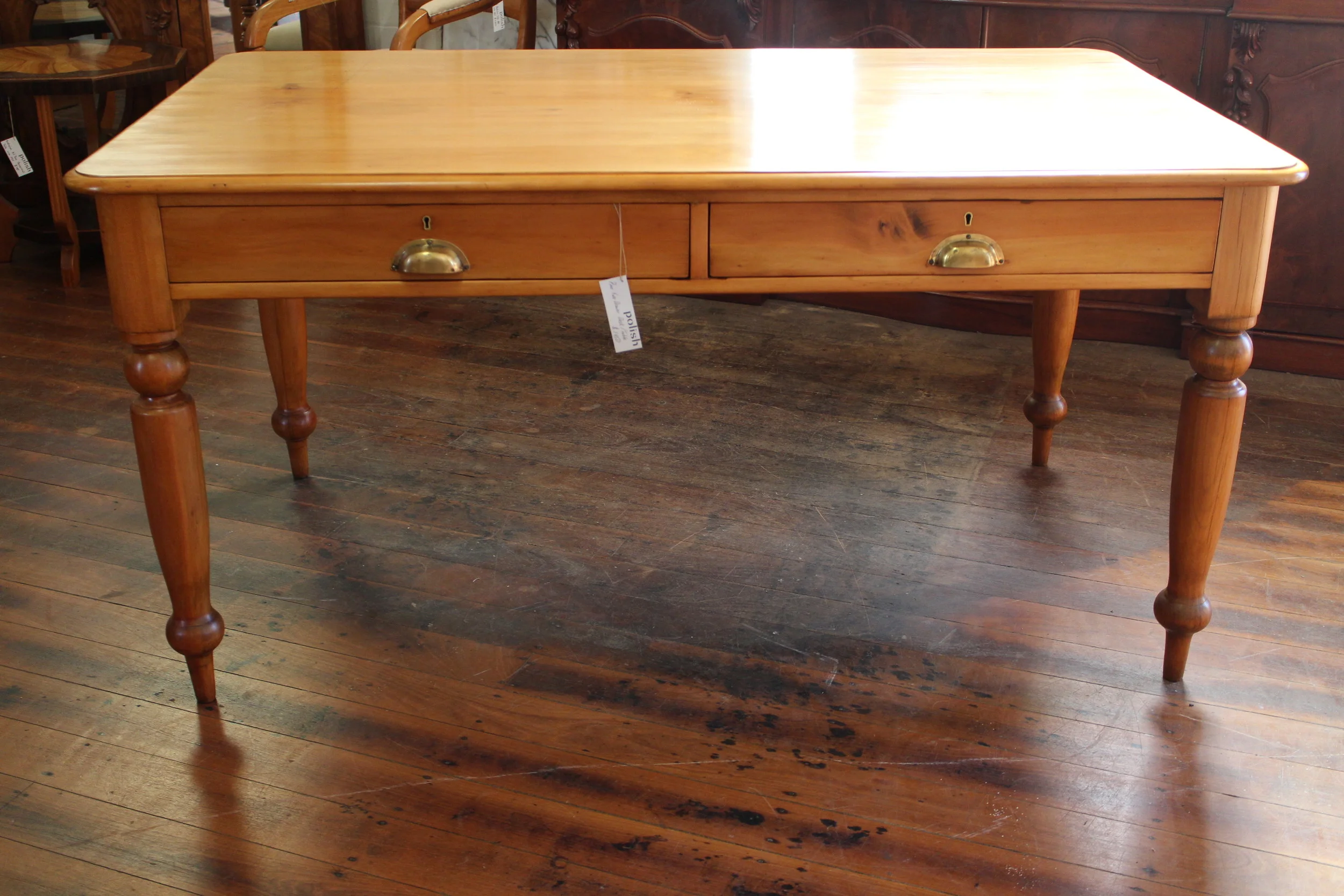 A Hoop Pine Two Drawer Antique Desk with brass handles ,circa 1880 .$1650.